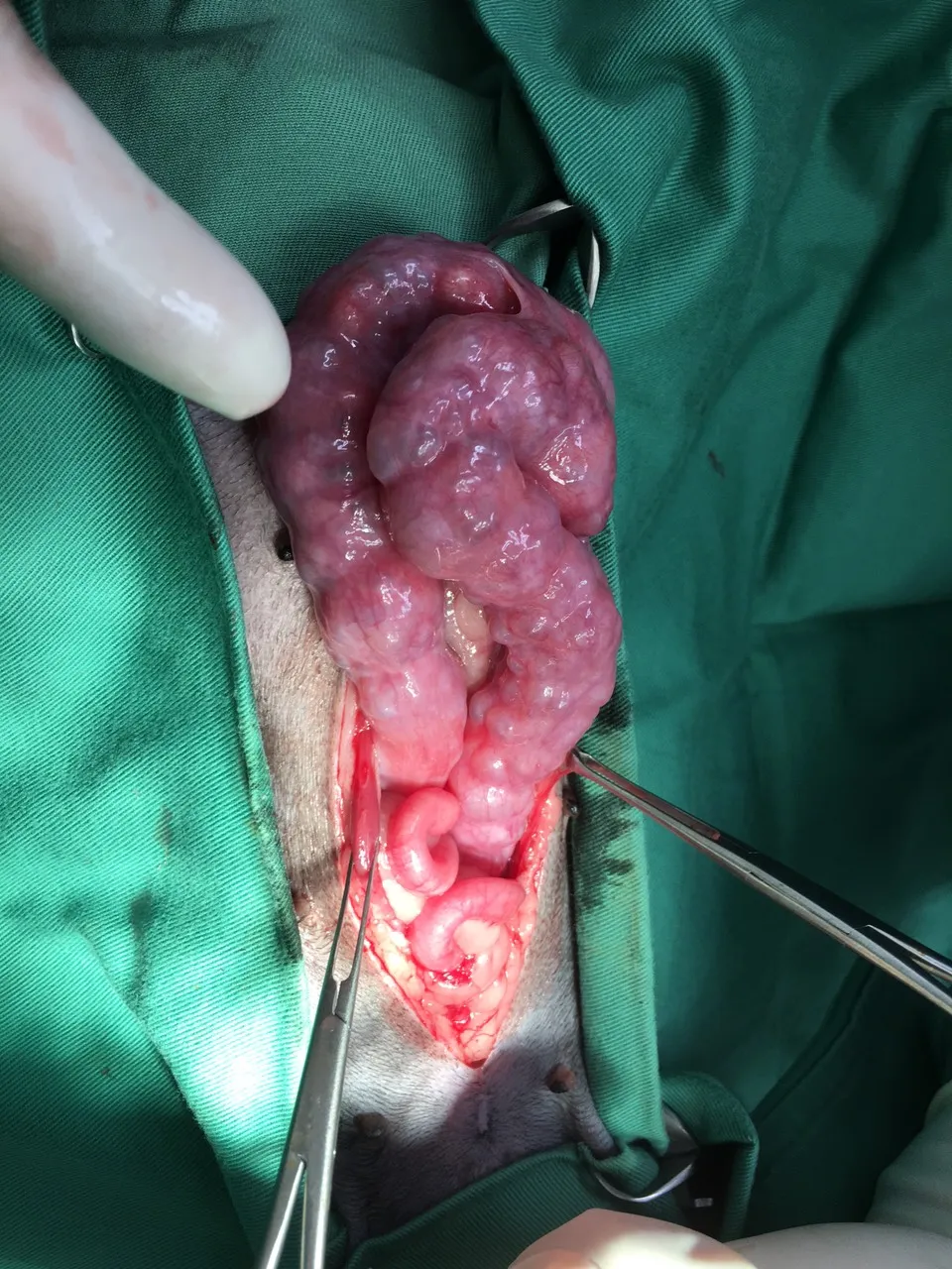 手術時の所見では、子宮・卵巣が、固く分厚く変形していて、表面が水泡の様なもので、ボコボコの形状になっていました。“子宮蓄膿症の一歩手前”のような所見で、何らかのスイッチでアッという間に子宮蓄膿症に至っていたでしょう。