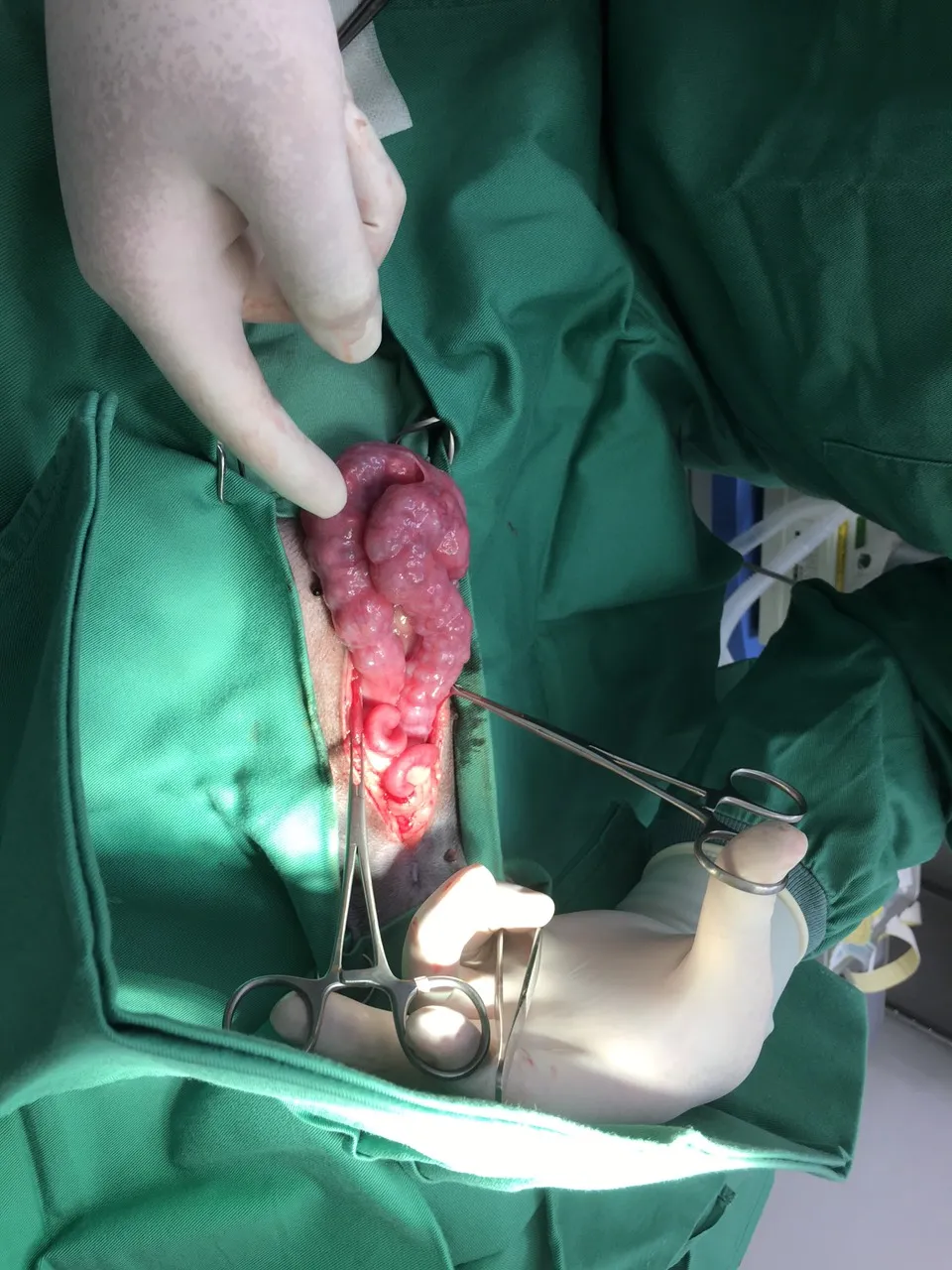 約7歳半のトイプードルのシャネルちゃんのお腹の巨大腫瘤を摘出しました。5kg程度のシャネルちゃんのお腹の大部分を占め、他の臓器を圧迫していました。